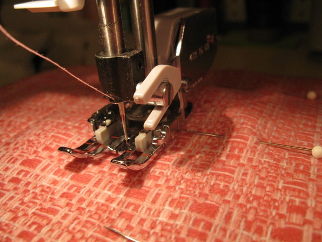 The next step on my Chanel jacket is to create the trim. Here is your chance to be creative with trims. Heck, part of my trim wasn't even purchased. Chanel has been known to even use the bias of the fashion fabric as a trim.I found this bright pink fabric at Joann's. I cut two inch bias strips. After looking at the strips, I decided that the two inch width was too big for the girl's jacket. I think an inch to an inch and a half is a more desirable width. So I take my scissors to trim down the trim. I want to keep the bias strips from unraveling all the way so I run two rows of straight stitching down the strips.